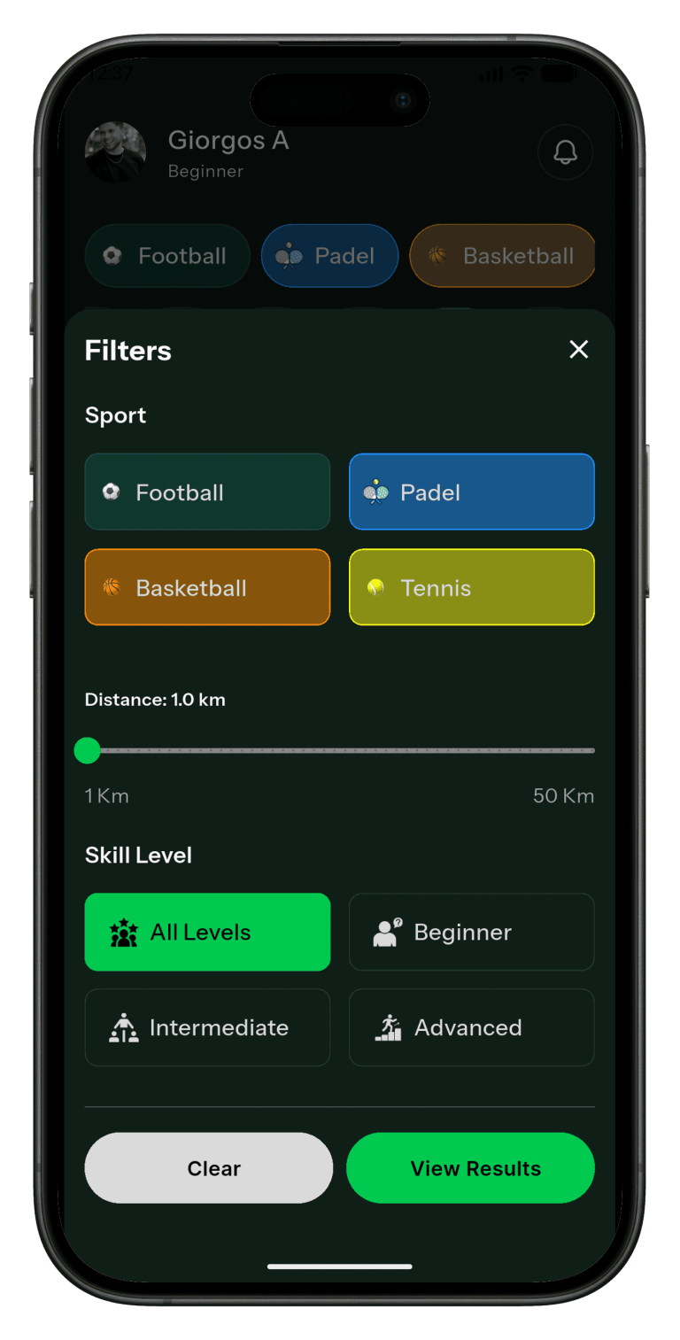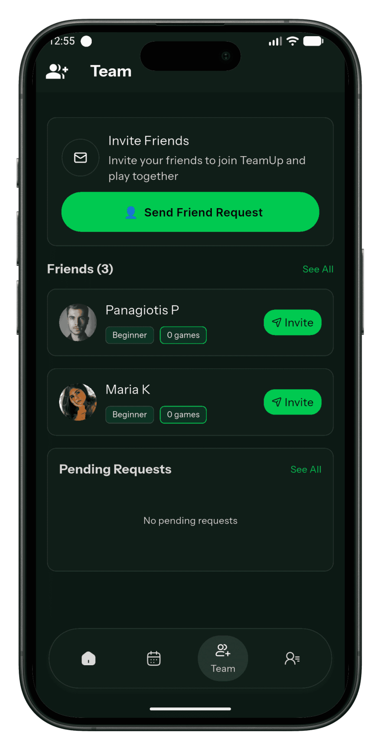 Connect • Compete • Play Your Next Game Starts Here Find local courts and teammates for Football, Basketball, Padel & Tennis — all in one app. Facebook Tiktok Youtube Instagram How it works From Download to Kickoff in 3 Simple Steps Pick a sport Choose from football, Padel, Basketball, or Tennis. View real-time availability at quality facilities and find a time that works for you. Reserve your spot View game details, rules, and costs. Sign up alone or invite friends! Complete payment safely and confirm your spot instantly. Show up and play Check-in at the court and enjoy the game. make new connections and meet players who share your passion for sports The Game Is Always Expanding Play your favorite sport — Football, Padel, Tennis, or Basketball We’re expanding to new sports and new areas across Greece. More courts, more matches, and more connections are coming soon. Our goal is to make it easier for players to find games, meet others, and stay active — no matter the sport. Ready to Elevate Your Game? Download TeamUp and start playing today. Grow Your Business with TeamUp Connect your facility to an active community of players and turn empty slots into confirmed bookings Maximize your court usage, fill off-peak hours, and manage bookings, availability, and payments easily through the TeamUp Partner Dashboard. Partner Portal